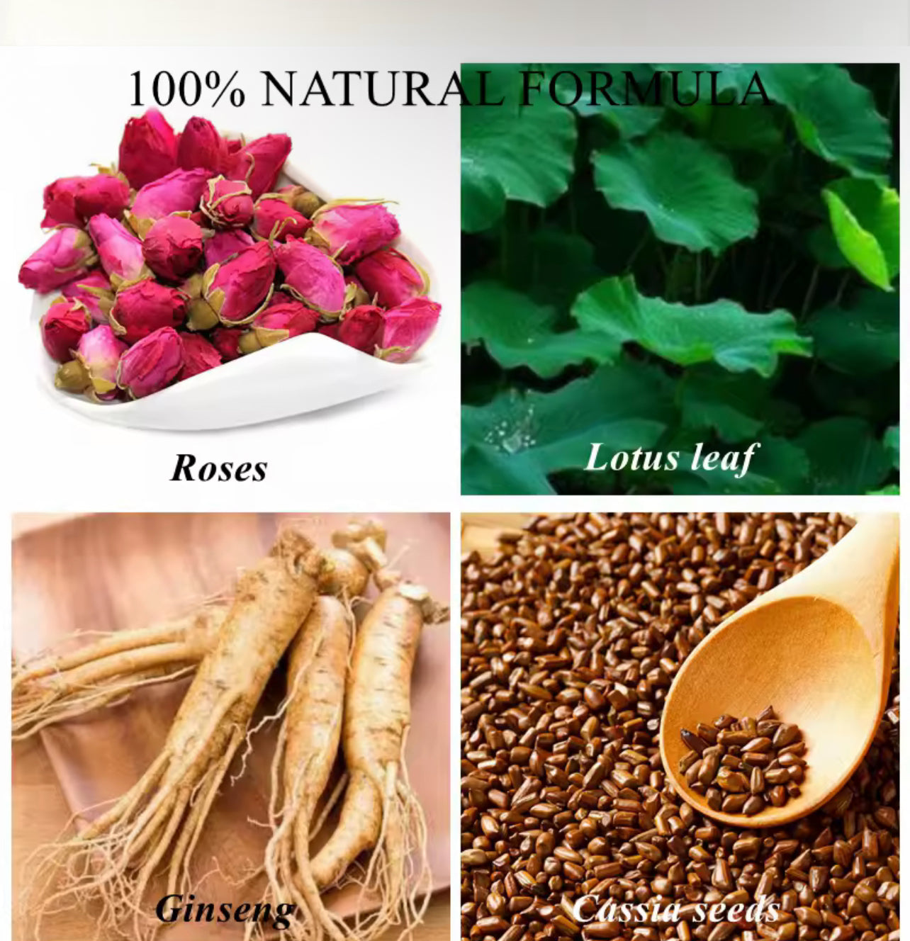 Green Tea, Senna Leaf, Ginger Root, Peppermint, Lemon Grass, and other natural herbs.